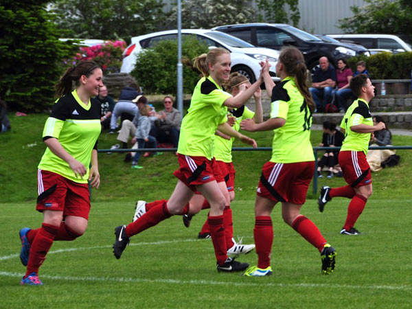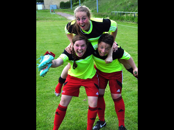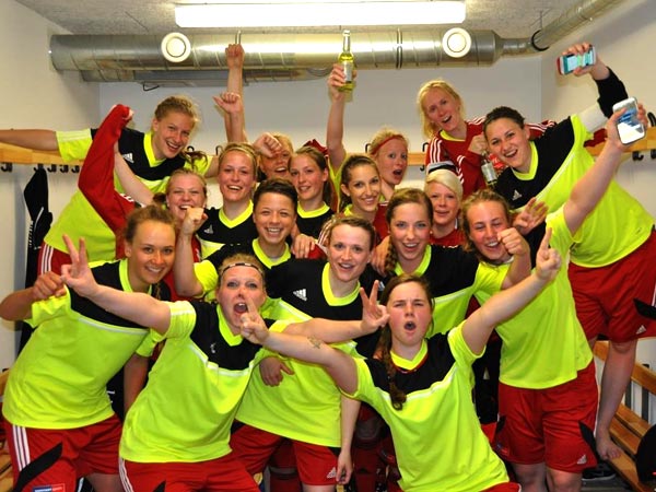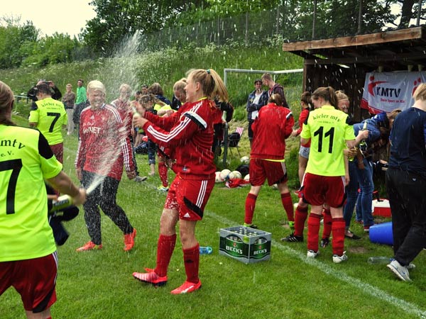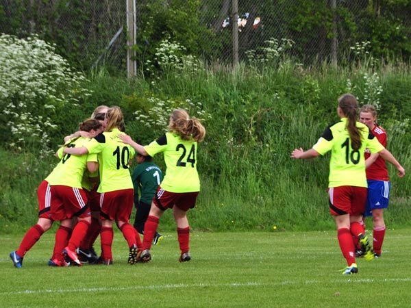 Nach dem Seitenwechsel und mit dem Wind im Rücken war schnell zu sehen, dass wir heute die Mannschaft waren, die mehr zu leisten im Stande war. Das waren schöne Spielzüge in den ersten Minuten nach Wiederanpfiff, jedoch vorerst ohne den nötigen Torerfolg. Dann kam Dana ins Spiel, und wir alle wussten um ihre Qualitäten als Törjägerin! Es dauerte nicht lange, bis Johanna eine Flanke auf den Fuß von Dana brachte, die direkt ins Tor einschob (61.). Die Stimmung war riesig und die gesamte Mannschaft wurde immer selbstbewusster. Freistoß an der Strafraumgrenze – ein Fall für Kapitänin Johanna. Gekonnt zirkelt sie den Ball ins Toreck (71.). Die Sensation zeichnete sich also bereits ab. Als dann Marie in der 83. Minute durch war und allein aufs Tor zulief, kochte die Stimmung über. Sicher legte Marie den Ball an der Torhüterin zum 3:1 vorbei und die Musik ertönte wieder. Auch in den 5 Minuten Nachspielzeit konnte uns die SG den Sieg nicht mehr streitig machen und mit dem Abpfiff wurde der Platz begeistert gestürmt.