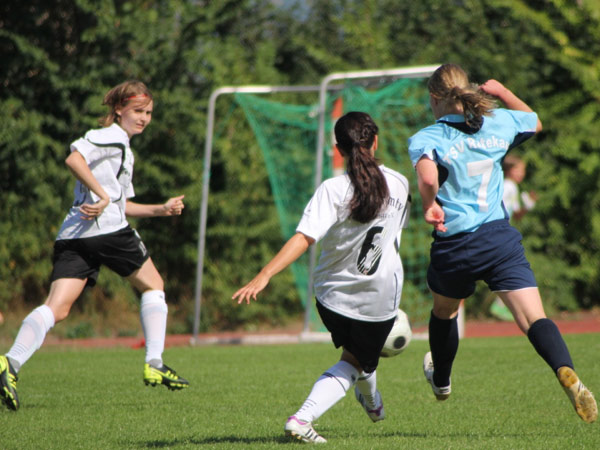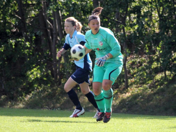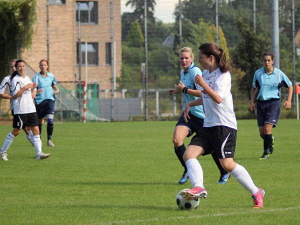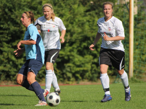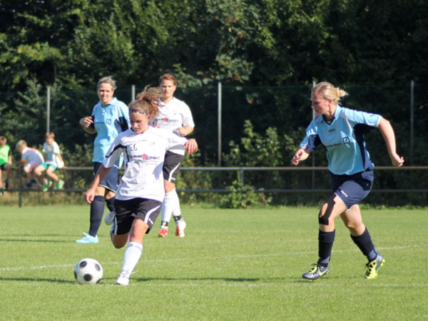 Es war für uns wohl die größte Frage, wie lange wir in der Lage sein würden, dieses hohe Tempo mitgehen zu können. Mit Mareike fiel unsere zweite Verteidigerin aus und so übernahmen Bente und Katja diese Positionen. Fünf Minuten nach Wiederanpfiff dann das 1:1 durch Johanna S.: Jasmin flankt einen Freistoß in den 16-er, der noch etwas abgefälscht zu Johanna S. kam. Das gab uns Kraft und wir bewegten uns weiterhin gut im Mittelfeld, sodass wir die Räume eng machen konnten. Defensiv standen wir konzentriert und ohne gavierende Fehler. Die Chance zur Führung hatte Nicole nur kurze Zeit später! Guter Abschluss, jedoch gegen die Latte. Sehr ärgerlich, dass wir dann nach einem Gestocher das 1:2 hinnehmen mussten. Wir steckten nicht auf und kurz bevor Dana für die viel gelaufene Nicole ins Spiel kam, markierte Nicole noch das 2:2 per Tunneltor. 20 Minuten waren nun noch zu spielen und wiederum sehr ärgerlich war dann das 2:3. Der Ball konnte im vierten Anlauf versenkt werden, nachdem wir den Ball nicht geklärt bekamen. Auch wenn der Treffer verdient gewesen ist, ärgerten wir uns sehr. Leider kam dann noch das 2:4 in der 82. Minute dazu. Laura stand beim Klärungsversuch am kurzen Pfosten dann doch schon hinter der Linie.