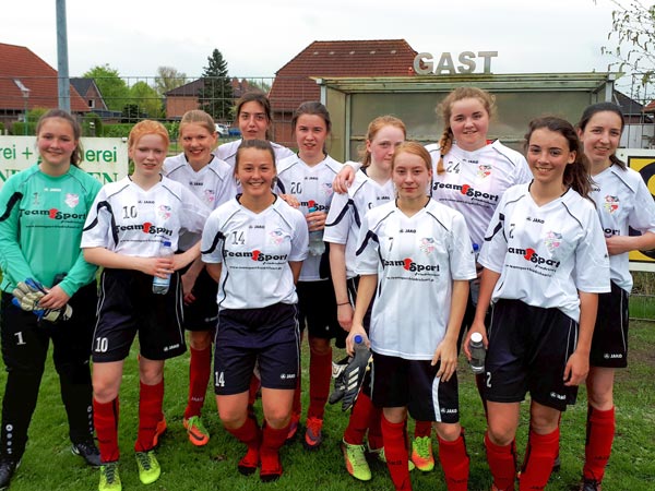 Viele verhinderte Mädchen dünnten heute den Kader stark aus. Mit Nike und Annika, die gestern bereits im C-Mädchenspiel dabei waren, kamen wir immerhin auf 11 Spielerinnen. Besonderes Kopfzerbrechen bereitete den Trainern die Innenverteidigung. Alle drei Spielerinnen, die hier in dieser Saison zum Einsatz kamen, standen nicht zur Verfügung. So fanden sich heute Bente und Clara auf dieser für sie ungewohnten Position wieder.
