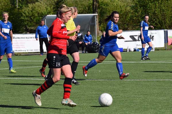 In der zweiten Halbzeit wurde das Spiel ausgeglichener. Wir konnten in der 57. Minute per Elfmeter auf 3:1 erhöhen. Hannah wurde im Sechzehner zu Fall gebracht und Sandra behielt die Nerven vom Punkt. Nicole hätte alles klar machen können, als sie nach Steilpass von Cathrin auf das Tor lief – an der Torfrau vorbei und den Abschluss knapp ans Außennetz gesetzt. Wenige Minuten später wollte Maj ebenfalls ihre Freistoßqualitäten zeigen. Der stramme Schuss landete jedoch an der Latte und den Nachschuss platzierten wir neben das Tor. Als dann der Ahrensburger Anschlusstreffer in der 85. Minute fiel, wurde es noch einmal hektisch. Wir warfen alles, was wir hatten in jede Aktion und brachten den Dreier über die Zeit.