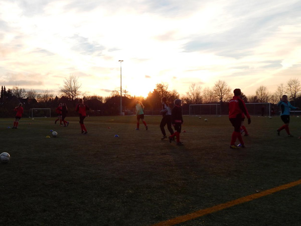 In Durchgang zwei wechselte Keesha für Joana ins Tor und es wurde viel umgestellt. Die Partie begann mit einem Weitschuss von Bordesholm in der 37. Minute, den Keesha, da er zentral kam, locker fangen konnte. Damit hatte die Heimmannschaft ihr Pulver verschossen und Keesha hatte eine ruhige kalte Halbzeit vor sich. Wir steigerten uns langsam und zeigten immer mehr, dass wir auch Fußball spielen können. Das Match verlagerte sich im Laufe der Partie immer weiter in die Bordesholmer Hälfte. Die Passgenauigkeit nahm zu und wir erzeugten nun oft Überzahlsituationen durch die nachrückenden und sich mit in die Offensive einschaltenden Defensivspielerinnen. Was wir aber auch offensiv anstellten, wollte doch keine 100% Torchance herauskommen. Die Flanken wurden knapp verpasst, in letzter Sekunde konnte noch ein Fuß den Torschuss abwehren oder der finale Pass kam nicht an. So hatte man ständig den Eindruck, dass der nächste Angriff das Tor für uns bringen würde. Doch die Minuten verrannen wie im Flug, das Spiel ging zu Ende und die Kieler Mädchen fragten sich, warum sie aus ihrer gefühlten Überlegenheit in der zweiten Halbzeit nicht mehr gemacht hatten.