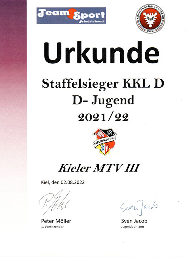 Die 3. D-Jugend hat in der Kreisklasse D (Kiel) eine hervorragende Saison gespielt. Bei nur 2 Niederlagen und diesem Unentschieden konnte das Team 11 Spiele für sich entscheiden und ist somit Meister der Kreisklasse D.