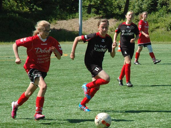 Die Mädchen begannen voller Spielfreude. Die körperlich überlegenen Gastgeberinnen konnten ihre Tugenden gegen unser Kombinationsspiel selten gewinnbringend einsetzen. So ging das Spiel meist auf das Flintbeker Tor. Wie gewohnt ließen wir zunächst einige klare Torgelegenheiten aus. In der 15. Minute schickte Lynn Justina alleine aufs Tor zu und wir lagen endlich in Führung. In der 26. Minute konnte Luna unser zweites Tor erzielen, indem sie einen Abschlag abfing, alleine aufs Tor zulief und einnetzte. Bis zur Pause blieb es beim 2:0. Die Mädchen hatten alles richtig gemacht, nur etwas höher hätte die Führung gern ausfallen dürfen.