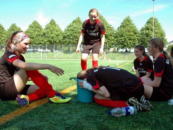 In der zweiten Halbzeit wechselten sich Hannah M. und Lea verabredungsgemäß im Tor ab und wir spielten so weiter wie bisher. Unsere Dominanz nahm eher noch zu. Justina eröffnete den Torreigen im zweiten Durchgang. Lynn hatte sich den Ball zentral erkämpft und schnell auf die startende Justina weitergeleitet. Zwei Tore für unser Geburtstagskind Justina. Herzlichen Glückwunsch! Danach war wieder Luna dran. Sie erkämpfte sich den Ball in der Abwehr, zog unwiderstehlich über den ganzen Platz und war von niemandem mehr zu bremsen. Nun lagen wir 4:0 in Front. In der 53. Minute durfte sich Hannah M. in die Torschützenliste eintragen. Lynn steckte einen zentralen Ball durch die Abwehr auf Hannah. Diese wurde körperlich stark bedrängt, setzte sich aber robust durch und schoss ins Tor. Die letzten beiden Tore gehörten Luna. Einmal nutzte sie entschlossen eine Lücke im Abwehrzentrum, brach durch und schob alleine vorm Tor ein. Das andere Mal spielte sie Justina frei. Nach dem Spiel gaben sich alle Mädchen neben dem Platz erst einmal eine Wasserdusche.