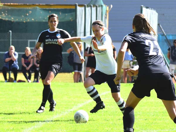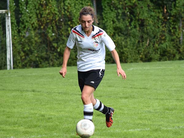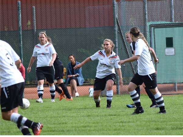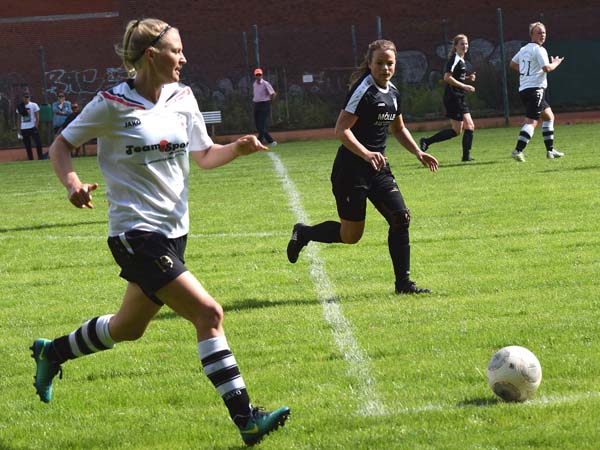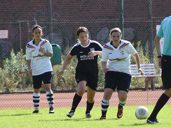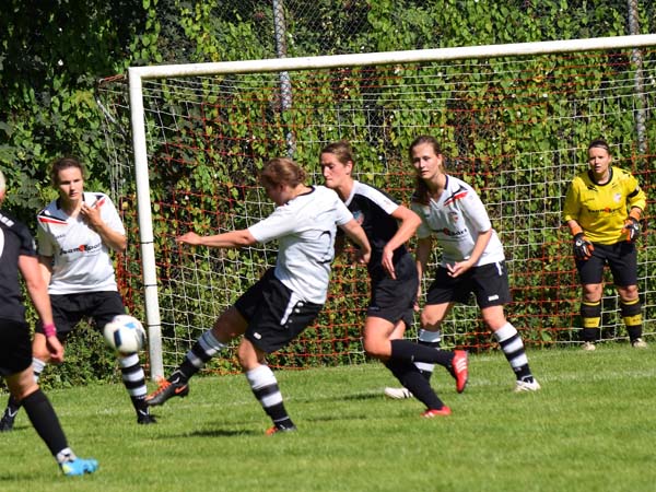 Die erste Viertelstunde war geprägt von Nervosität und Hektik. Ein ordentliches Aufbauspiel kam nicht wirklich zu Stande. Beide Teams zeigten viel Engagement und gingen beherzt in die Zweikämpfe. Die erste Gelegenheit hatte Lefke, als sie einen Volleyschuss knapp am Tor vorbei setzte, gefolgt von sehenswerten Möglichkeiten durch Sabeth, Sandra und Lefke. Glück hatten wir bei einem klasse Angriff der Gastgeberinnen, die nur die Latte trafen. Kurz vor der Pause gibt es einen Freistoß für Russee. Bahr stiehlt sich im Rücken davon und trifft zur 1:0-Führung für die Gastgeberinnen.