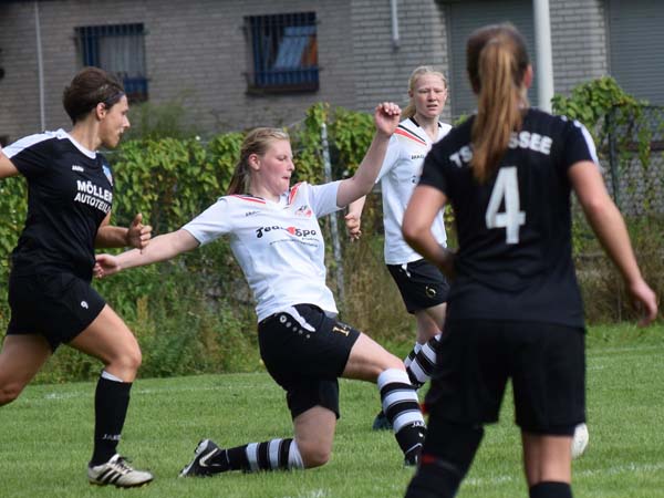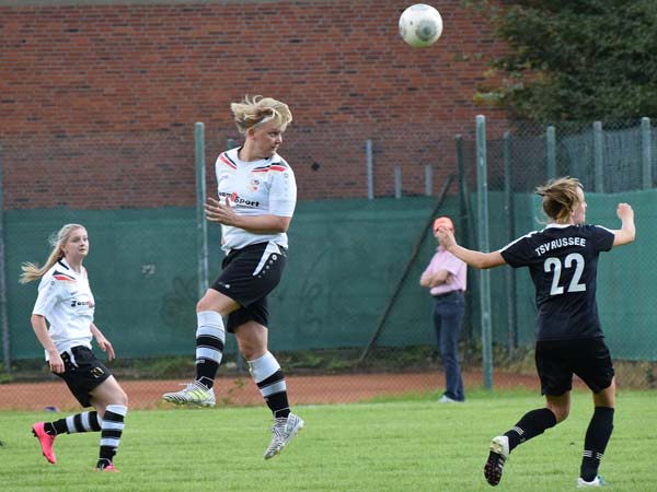 Wir wollten uns jedoch nicht aus der Ruhe bringen lassen und weiter unserer Linie treu bleiben. Gleich zu Beginn des zweiten Durchgangs dann eine unglückliche Situation: Konter Russee – Andrea kommt raus, köpft den Ball vor einer Russeer Angreiferin und geht zu Boden. Das Spiel läuft weiter, der Schiedsrichter unterbricht nicht und in der Folge schießt Russee das 2:0. Sicherlich eine grenzwertige Situation, in der man auch anders hätte handeln können. Sei es drum – wir ließen nicht locker und wurden nur umso energischer. Den schnellen Anschlusstreffer erzielte Sabeth, nachdem Carolin den Spielzug über Sandra eingeleitet hatte, die Sabeth in den Lauf mitnahm. Sabeth ließ die Torhüterin stehen und schob zum 2:1 ein. Wille und Körpersprache waren eindeutig! Beide Mannschaften schenkten sich wenig und Lefke verwertete den Freistoß von Carolin zum 2:2 per Kopf gegen die Laufrichtung der Torhüterin. Jetzt wollten wir mehr, aber Russee gab sich nicht auf und erzielte durch einen Freistoß das 3:2. Cathrin hatte auch hier die richtige Antwort parat. Vorgelegt von Carolin verwandelte Cathrin aus der Drehung aus gut 20 Metern vor dem Tor zum 3:3. Es waren noch ca. 20 Minuten zu spielen. Wir nutzten die Phase und erhöhten den Druck weiter. Unser Fleiß sollte heute belohnt werden. Die heute stark aufspielende Carolin setzte den Schlusspunkt nach Pressing auf Außen und Ballgewinn mit einem platzierten Schuss zum erlösenden 4:3 in der 72. Minute. Bis zum Ende ergaben sich noch ein paar Möglichkeiten. Die größte Chance hatte Sandra, wobei ein klares Handspiel im Strafraum vorausging, der Pfiff zum Strafstoß aber ausblieb. Liske hatte ebenfalls eine klasse Gelegenheit, die pariert wurde.