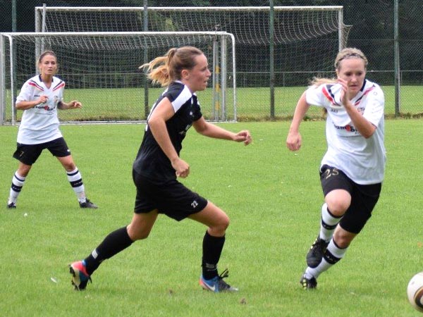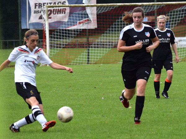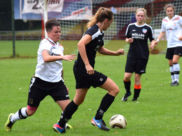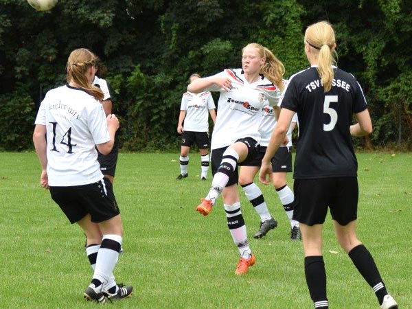 Es ging heiß her an der Rendsburger Landstraße und die Zuschauer bekamen ein spannendes und körperbetontes Spiel zu sehen. Wir konnten gleich von Beginn an das Spiel an uns reißen und liefen gegen eine Abwehrwand. Russee – wie gewohnt stark in der Physis – stellte uns gut zu und es ergaben sich nicht viele Torchancen. Dann gerieten wir sogar in Rückstand nach einem langen Ball in der 35. Minute. Sehr ärgerlich, aber irgendwie auch typisch für uns. Ziemlich unbeeindruckt agierten wir weiter im Spiel nach vorne. Lisa hatte die größte Möglichkeit zum Ausgleich, als sie nach Gassenspiel von Sabeth die Torhüterin überlupfte und gerade noch abgefangen werden konnte.