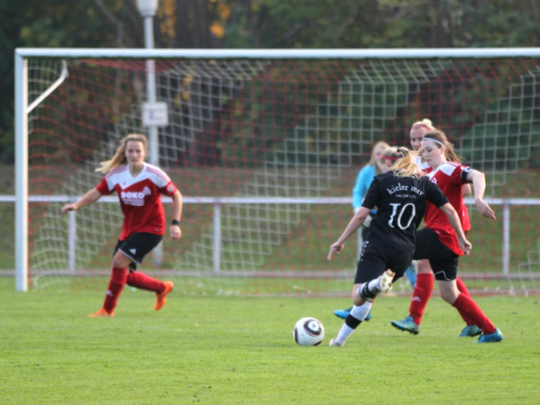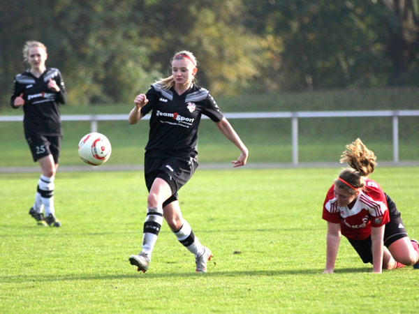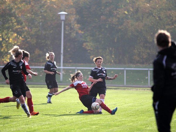 Das Spiel begann von beiden Seiten sehr intensiv und wurde auf Augenhöhe geführt. Zweikampfverhalten und Laufbereitschaft waren auf unserer Seite makellos. Und so versuchten wir den wenigen Platz, den wir hatten, zu nutzen. Stephanie verpasste nach klasse Abschluss das Tor nur knapp und auch Lisa hätte mit ein wenig Glück die Führung erzielen können. Kurz vor der Pause hatte Carolin in guter Position eine Möglichkeit, leider wurde der Ball zu schnell und konnte nicht gut verarbeitet werden. Viele Ecken und Freistöße wurden zum Teil gefährlich vor das Tor gebracht, jedoch ohne Erfolg.