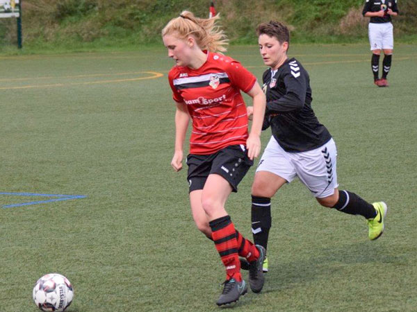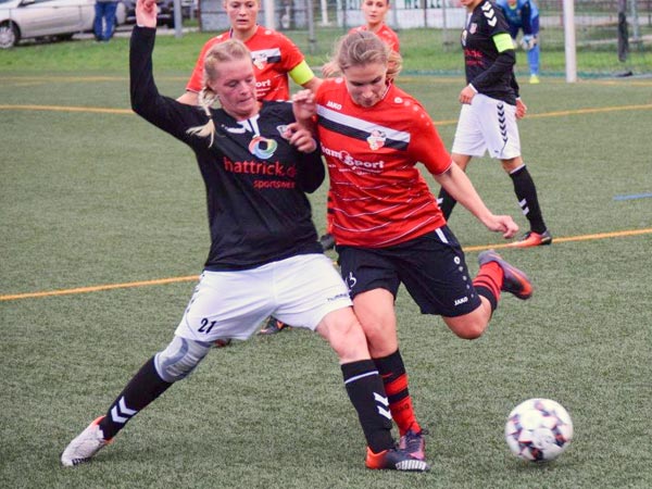 Beide Teams legten ein ordentliches Tempo vor. Die erste Gelegenheit hatte Siems auf dem Fuß. Nach einer Flanke von links verpasste die Stürmerin knapp. In der 7. Minute konnte sich Annika durchsetzen und enteilte Richtung Tor. Sie war nicht zu stoppen und war kurz vor dem Einschieben, als sie im Sechzehner von hinten von den Beinen geholt wurde. Keine Bewegung zum Ball und letzte Frau – das bedeutet eigentlich glatt rot. Der Schiedsrichter hatte es aber bei gelb und dem fälligen Elfmeter für uns belassen. Eine klare Angelegenheit für unsere Sandra. Sicher verwandelte sie zur frühen 0:1-Führung. In der Folge entwickelte sich ein sehr robustes und hochklassiges Oberligaspiel. Chancen auf beiden Seiten, wobei für uns Stephanie vor dem Tor vergab und ein strammer Schuss von Maj klasse pariert werden konnte. So ging es in die Halbzeit und wir wussten, dass es weiterhin eine unheimlich schwere Aufgabe sein würde.