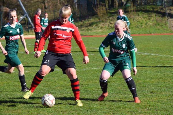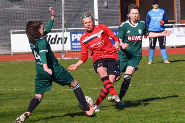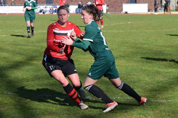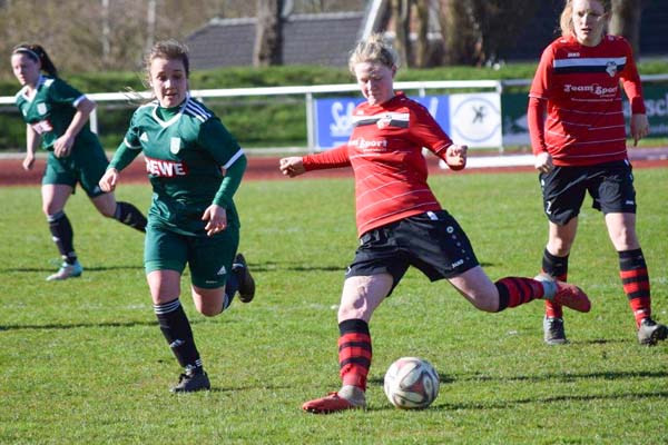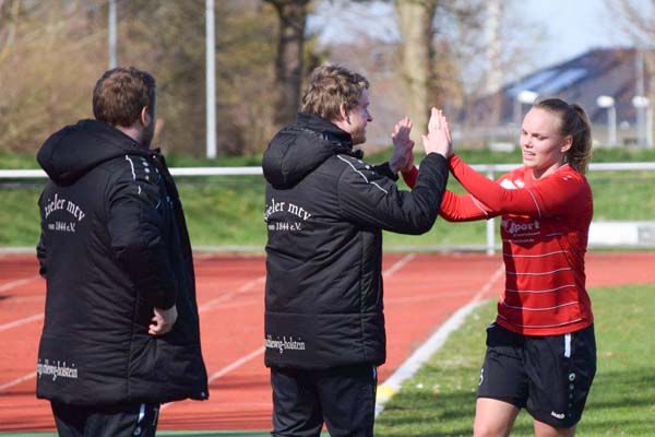 Es ging rasant los und wir konnten in den ersten Minuten zeigen, wie viel Feuer in der Mannschaft steckt. Hannah mit einem klasse Solo auf rechts spielt den Ball zu Sophia, die eine Flanke auf Sandra bringt. Eiskalt verwandelt diese zum für die Mannschaft beruhigenden 1:0. In der Folge hatten wir einige gute Gelegenheiten, wussten diese jedoch nicht zu nutzen. Hannah auf links war im 1-gegen-1 vorbei an der letzten Verteidigerin, vergab dann knapp vor dem Tor (16.). In der 29. Minute durfte Cathrin auch endlich das Feld betreten. Sie hatte den langen Stau auf der A23 besiegt und konnte nun helfen. In diesem sehr intensiven Spiel merkten wir, dass Meldorf im Kampf um den Klassenerhalt alles versucht. Ein Tor sollte bis zur Pause nicht mehr fallen.