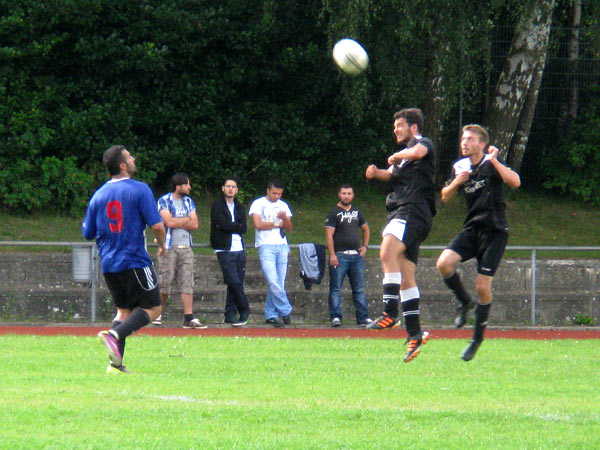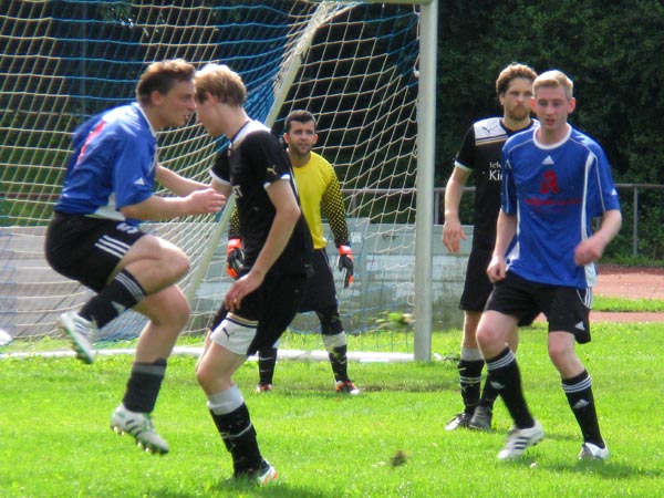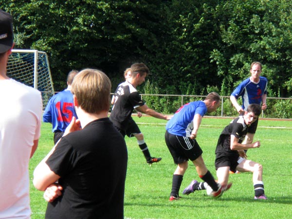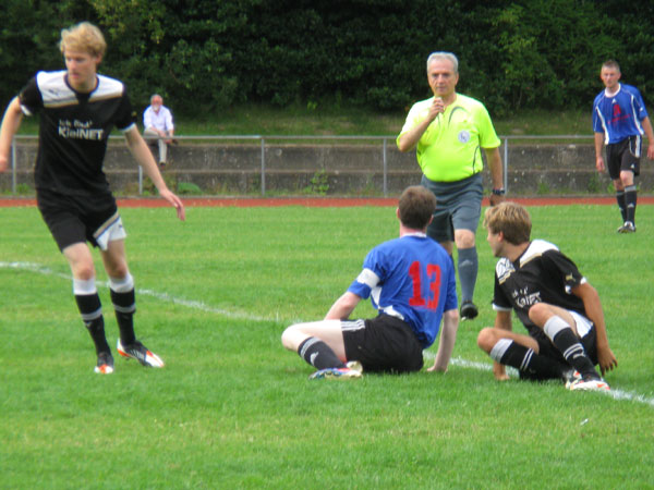 Es dauerte keine drei Spielminuten, da zeigten die Hausherren schonmal, welche Gangart das Spiel in der sengenden Hitze bekommen sollte. Nachdem die Gastgeber auch in den Folgeminuten weiterhin ordentlich hinlangten, kamen sie auch zu ihren ersten Chancen. In der 10., 12. und der 14. Spielminute waren es jeweils lange Bälle, die ihre Abnehmer in der gegnerischen Hälfte fanden. Danach fand auch der KMTV besser ins Spiel und kam seinerseits zu einer guten Torgelegenheit. Hannes tauchte mit dem Ball alleine vor dem TuS-Keeper auf und schoss diesen leider an (20.). In der 22. Minute zerrte sich Janis und musste raus. Die gerade erst wieder gefundene Teamordnung löste sich nach der Auswechslung und den damit verbundenen Umstellungen langsam wieder auf. In der 36. Spielminute hatte der KMTV nochmal Glück, als man das Abseits selbst aufgehoben hatte und der Gegner sich durchtankte. Drei Minuten später war das Glück jedoch für heute aufgebraucht. Nach einer Szene wie aus "Pleiten, Pech und Pannen" gelang es einem Mettenhofer, den Ball vorbei an Henner, der bis dahin souverän parierte, zu schieben. In den Folgeminuten brannte es noch 2- bis 3-mal lichterloh in unserer Hintermannschaft.