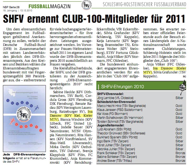 Herzlichen Glückwunsch und vielen Dank an unsere Fußballjugendobfrau Ina Dassow, die vom KFV Kiel zur Ehrenamtspreisträgerin 2010 benannt wurde und außerdem zusammen mit Anja Völker (FFC Oldesloe) und Silvia Grafunder (TSV Kappeln) im Jahr 2011 im "Club 100" die Farben Schleswig-Holsteins vertreten wird.