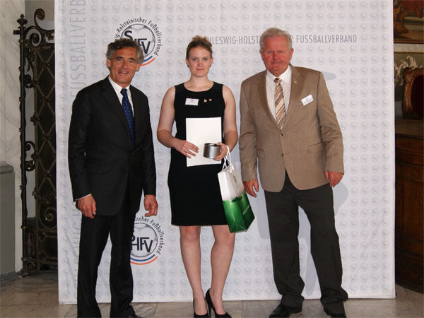 Das Wochenende 26./27. April 2014 hat unsere langjährige Trainerin Laura Domin mal nicht auf dem heimischen Professor-Peters-Platz oder Fußballplätzen gegnerischer Fußballvereine verbracht, sondern sie hat sich mit ihrem Lebensgefährten auf den Weg nach Malente in den Uwe-Seeler-Fußballpark gemacht. Hierher wurden nämlich die Preisträgerinnen und Preisträger des DFB Ehrenamtspreises 2013 eingeladen. Bereits im Rahmen der KMTV-Delegiertenversammlung am 27. März erhielt Laura aus den Händen von Hans-Ludwig Meyer, dem Präsidenten des Schleswig-Holsteinischen Fußballverbandes (SHFV), eine Plakaturkunde des SHFV. Herr Meyer hob in seiner Laudatio vor den Delegierten des Kieler MTV das herausragende Engagement der erst 22-Jährigen hervor.