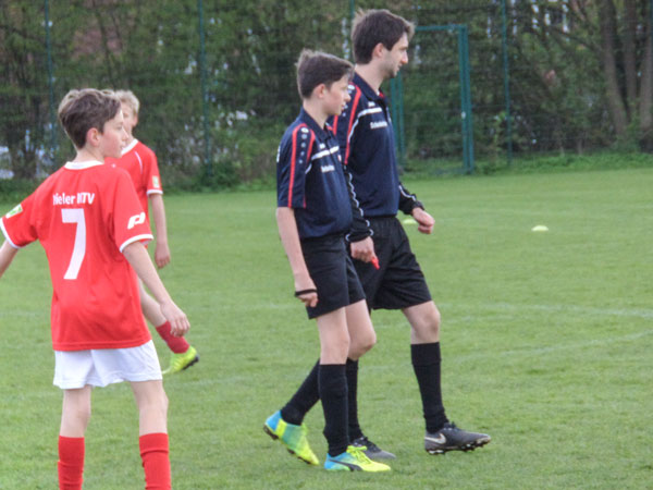 Aufgrund der langen Schlechtwetterphase verzögerte sich der Start des Projektes, doch am 26.04.2018 war es endlich soweit und Mattis (13) durfte sich im Spiel der D2-Jugend gegen den Wiker SV II das erste Mal an der Pfeife beweisen. Die ersten Schritte musste er allerdings nicht alleine unternehmen, sondern hatte als Unterstützung Schiedsrichter David Löhnert an seiner Seite.